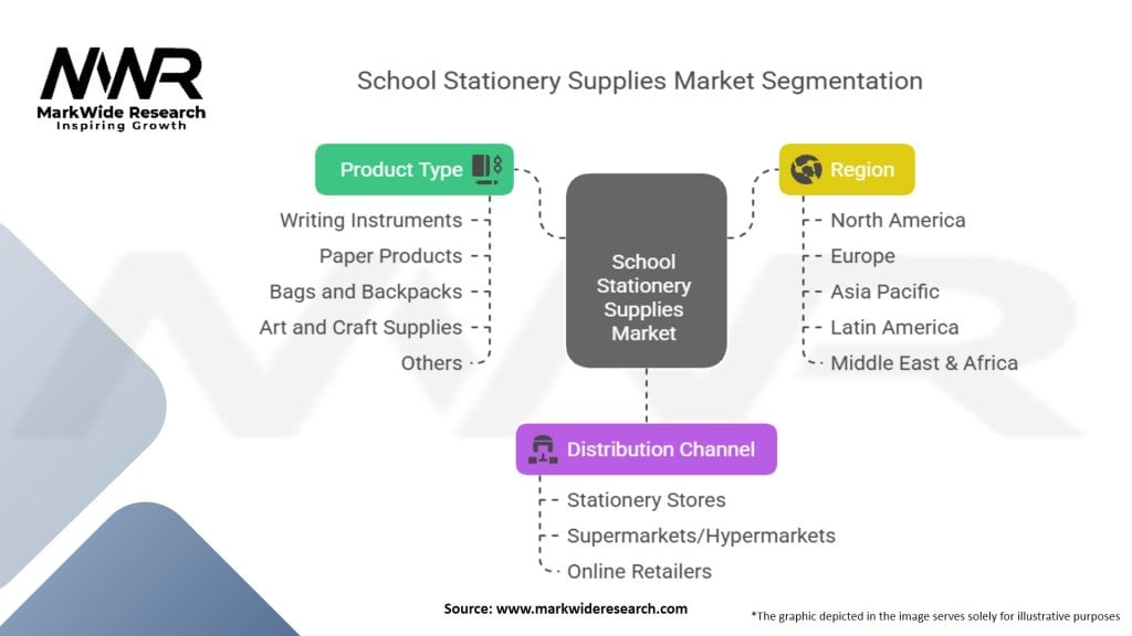 The school stationery supplies market can be segmented based on product type, distribution channel, and end-user. Product types include writing instruments, paper products, storage solutions, art supplies, and others. Distribution channels encompass offline retail stores, online platforms, and direct sales. End-users include students from primary schools, secondary schools, and higher education institutions.